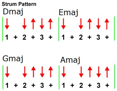 Again we have a fairly simple right hand strumming pattern which will enable you to concentrate more on the left hand.
