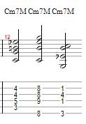 The final chord is going to be a Minor-Major 7th chord (Chord #31-33). Now, this may be a little odd sounding and a little complicated but in reality, it’s formula is: (C-Eb-G-B) All it is, is just a Minor triad (C-Eb-G) with a major 7th (B) on top of it. Intervalically, this one would go: (Root, Minor 3rd, Perfect 5th, Major 7th) To build the A form we take the original Major 7th chord form we had when we first started and lower the 3rd on the B string one fret to Eb. To get the E form of this chord, we take the original major 7th chord form we had at the start and lower the 3rd on the G string one fret to Eb. And to build the B form of this chord, we take the original Major 7th chord form we had at the start and lower the 3rd on the D string one fret to Eb to give us our Minor-Major 7th.