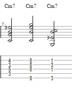 Now onto the Minor 7th chord. For this 7th chord (Chord #19-21), we lower the 7th as well as the 3rd. So with this new information, we have the makeup of a minor 7th chord which is: (C-Eb-G-Bb). Intervalically, this chord can be seen as: (Root, Minor 3rd, Perfect 5th, Minor 7th). For the A form of this chord we just take the Dominant 7th form we had before and lower the E on the B string down one fret to Eb. For the E form all we do is take the dominant 7th form we had before and lower the E on the B string one fret to an Eb to get our Minor 7th chord form. And for the B form, all we do is lower the E from the dominant 7th form we had to Eb on the D string.