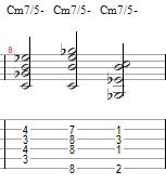 Now, to build a Minor 7th flat 5 chord (Chord #22-24), or more commonly known as a Half Diminished 7th chord, we take the original Minor 7th form we had before and we lower the 5th one half step or a minor second down to Gb, so now the formula for a Half- Diminished 7th chord would go: (C-Eb-Gb-Bb). Intervalically, this chord is seen as: (Root, Minor 3rd, Diminished 5th, Minor 7th) To build the A form of this chord, we take the original minor 7th form we had before, but lower the 5th one half step to Gb on the D string. To build the E form of this chord, we take the Minor 7th form we had before and lower the G on the B string down one fret to Eb and to build the B form, we take the minor 7th chord of that chord form and lower the 5th on the low E string one fret to Gb.