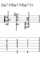 Now onto the Minor 7th sharp 5 chord (Chord #25-27). This one is built by raising the 5th up one half step to G# so now it would go (C-Eb-G#-Bb)Intervalically, this is seen as (Root, Minor 3rd, Augmented 5th, Minor 7th) The A form of this chord is built by taking the Minor 7th form and raising the 5th on the D string up one fret to G#. The E form of this chord is built from taking the Minor 7th form of this chord form and raising the 5th on the B string up one fret to G#. The B form of this chord is built by taking the original Minor 7th chord form and raising the 5th on the low E string one fret up to G#.