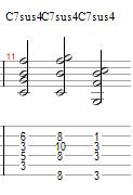 The next to last chord is going to be the 7sus4 chord (Chord #28-30), which should be pretty self explanatory, but if not, all it is, is taking the Dominant 7th form (C-E-G-Bb) and raising the 3rd up one half step to F to create a Dominant7th Suspended 4th chord, where the formula goes: (C-F-G-Bb) Intervalically, this can be seen as (Root, Perfect 4th, Perfect 5th, Minor 7th) To build the A form of this chord, we take the original Dominant 7th chord form we had before and raise the E on the B string one fret to F. To build the E form of this chord, we take the dominant 7th chord form before and raise the E on the G string up one fret to the F. To build the B form of this chord, we take the original dominant 7th chord form we had before and raise the 3rd E on the D string up one fret to F to give us our Dominant 7 sus4 chord.