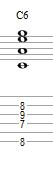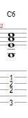 The first 6th chord we are going to look at is an E form Major 6th chord. This is built with the root on the low E string, the 6th on the D string, the 3rd on the G string, and the 5th on the B string.