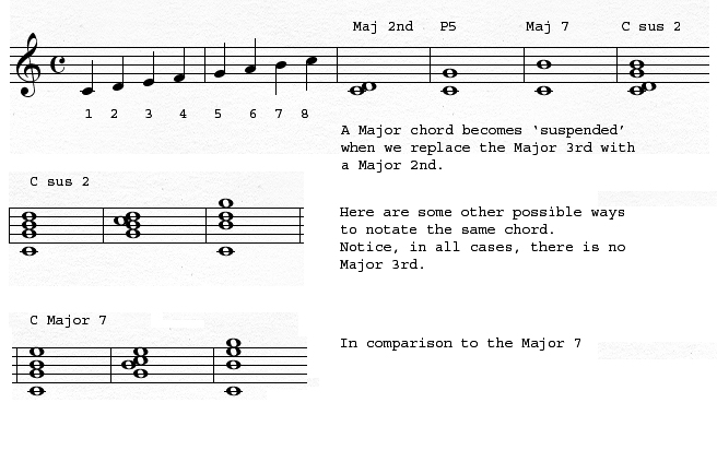This term 'suspended', also abbreviated as 'sus', is telling us that the Major 3rd is not present in the chord. Suspended 2nd is telling us that the 2nd has replaced the 3rd.