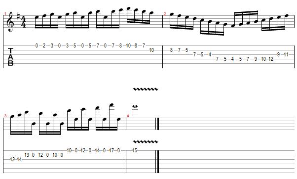 The second example is in the key of E minor and also incorporates open strings for a variation on this technique. Open strings are a good way to add spice to your playing. I use this technique often.