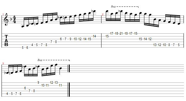 The third example is in the key of A Phrygian Dominant and covers most of the fretboard while incorporating a bit of string skipping as a variation.