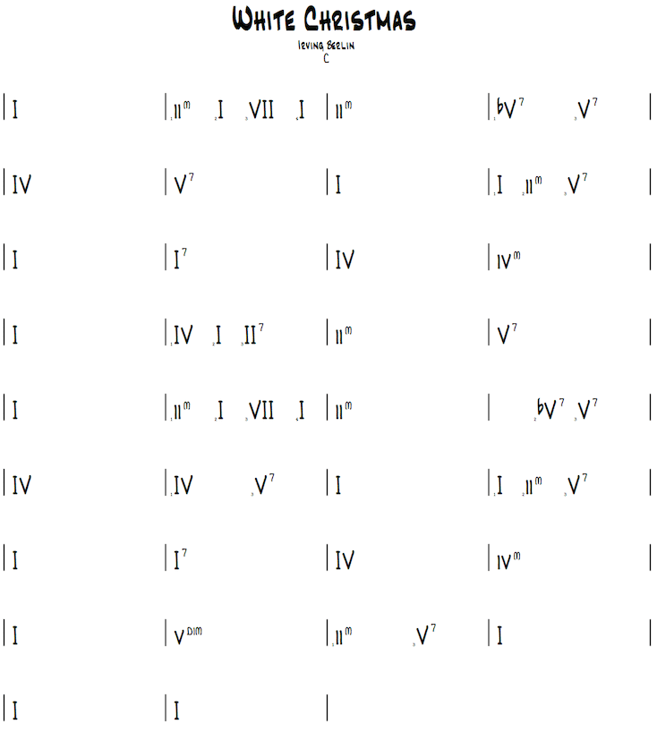 I've included two classic Christmas charts for you to practice on. Its not important to embellish the changes just yet. This lesson is aimed at getting you to a level where you're comfortable in a situation where accompaniment is needed quickly. The first and easiest chart that I've included is Irving Berlin's classic, "White Christmas". The chord in the first measure is held for four beats, and in the second measure, each chord receives 1 beat. In this scenario, assume there are four beats that occur between every line. Use the chords correspondingly.