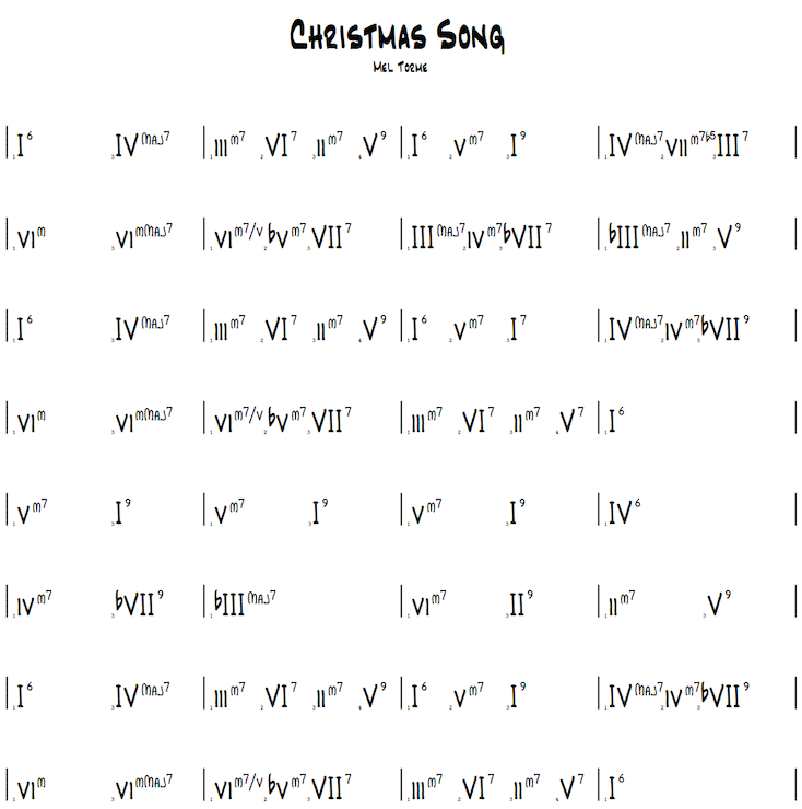 The second chart by Mel Torme is a bit more complex. You begin to see some of the aspects that we talked about earlier. You will encounter things such as extensions (7ths) , chords with accidentals, and inversions. This is where a drum loop comes in handy. Once you get a good groove going, share your newly acquired Christmas repertoire with family and friends. Enjoy the holiday season!