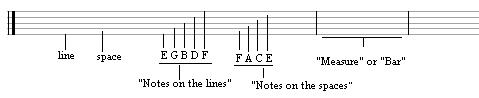 On the staff, there are 5 lines and 4 spaces. The 5 lines consist of the notes, starting from lowest line to highest: E, G, B, D, F. A good way to remember them is: "Every Good Boy Does Fine" The notes on the spaces, starting from lowest to highest is: F, A, C, E. A way to remember these is just to remember the word "Face" These notes are divided up into what are called "Measures" or "Bars" on the staff.