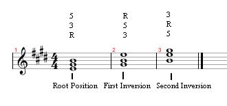 You may be wondering "what is an inversion?" Well, there are 3 classifications of inversions: Root Position, First Inversion, and Second Inversion. Root position is a triad built as: Root, Third, Fifth. First Inversion is when we take the root and put it an octave higher so that the 3rd of the chord is now in the bass, which would go: Third, Fifth, Root. Second Inversion is when we move the third an octave higher so that the 5th is in the bass, which would go: Fifth, Root, Third.