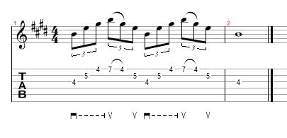 Make note that when practicing this sweeping pattern, that you set your metronome to a comfortable tempo, around 60 bpm. This is not a race. You're just trying to get the basic movements down first. Make sure that each note rings out cleanly and that you aren't muffling any of the notes. Also, make sure you are lifting your finger slightly after you play a note so that you don't get any unwanted noise. And make sure that after playing a note and lifting your finger, mute the string ever so slightly with your right hand along the bridge so that the open string doesn't ring out. And note that when playing this, that you are pulling off from the 7th fret to the 4th fret and that isn't picked.