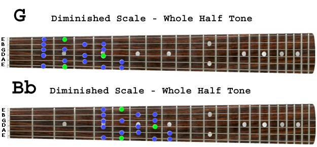 Practice the scale exercise and familiarize yourself with it over the entire fretboard. Move the pattern up or down one semitone to achieve all the other possible Whole Half Tone/ Diminished scales.