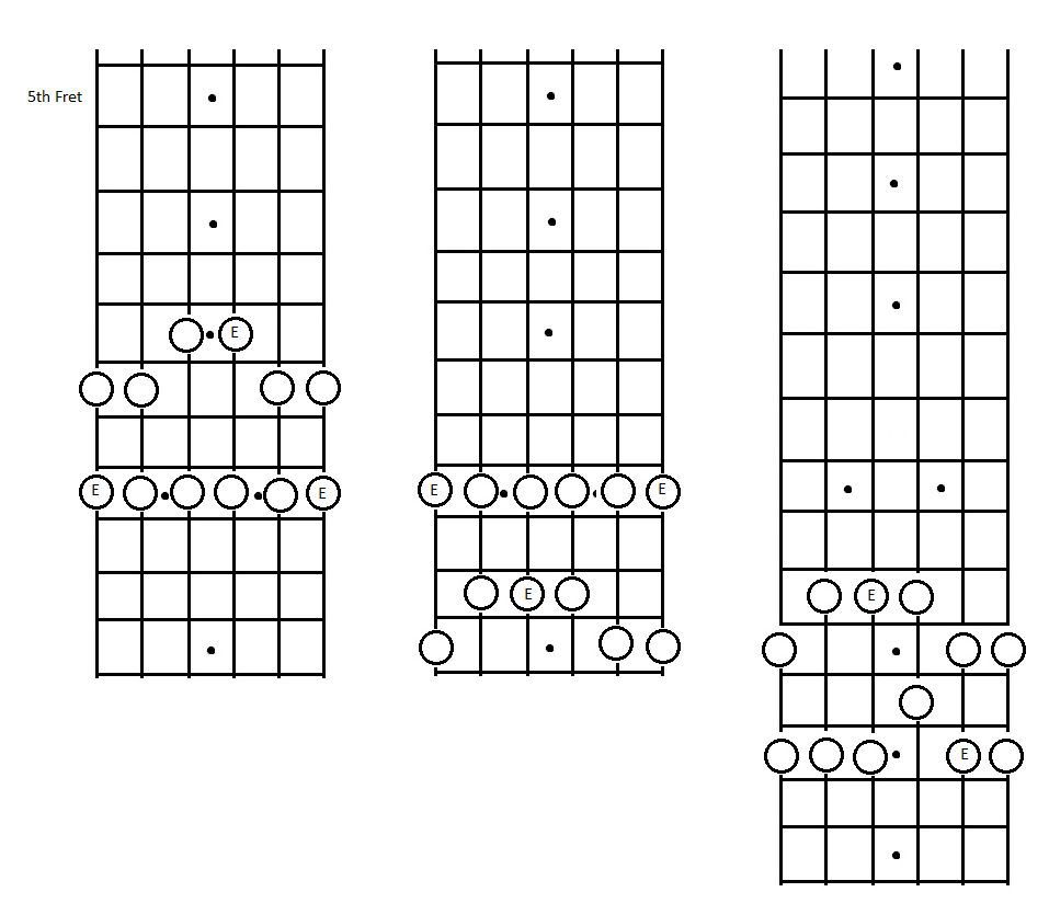 We will be in the key of E minor and will be using three different pentatonic boxes. I suggest you familiarize yourself with the pentatonic shapes below, if you haven't already.