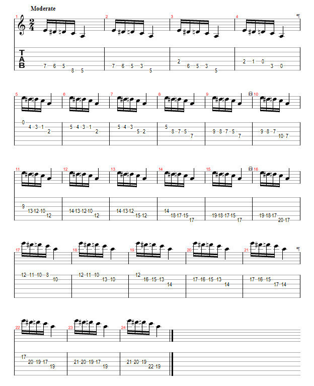 In this exercise will we take a short sequence or ”lick” if you may in the A blues scale and pay that in varied fingerings all over the neck. The scale parts we will use are… the whole thing: