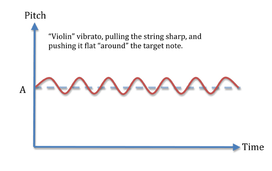 The violin or classical vibrato is not something you'll find many players using these days, Holdsworth being one noteable exception. As mentioned in the vid, and exemplified below, it entails pulling and pushing the string along the length of the fretboard, thus lengthening and shortening the string. This will cause the pitch to either rise or drop in relation to the fretted pitch. And very subtle vibrato, which can be duplicated with any whammy-bar. However, it is still a good vibrato to know, and to have in your bag of tricks!