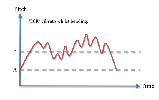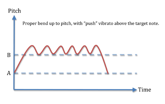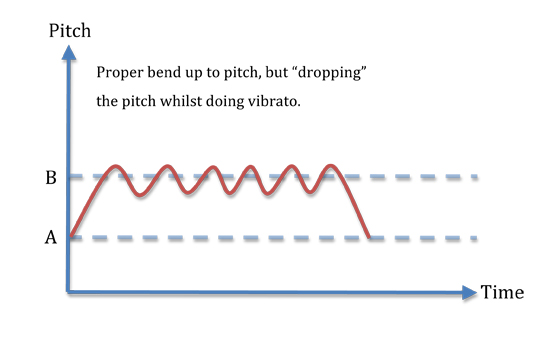 However, a unique problem with bending and vibrato is that you can actually bend, and then drop the pitch below the target pitch as you do your vibrato, not keeping it above the line so to say. This is a very common mistake amongst beginners, and sometimes with those that have been at it for quite some time. Check the to hear just how bad this sounds =)