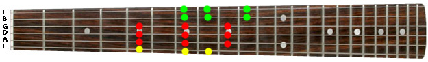 If you look at the diagram below you'll see that the scale starts on the second of our fingering no.3's (yellow dots) followed by three fingering no.1's (red dots) and then two fingering no.2's (green dots).